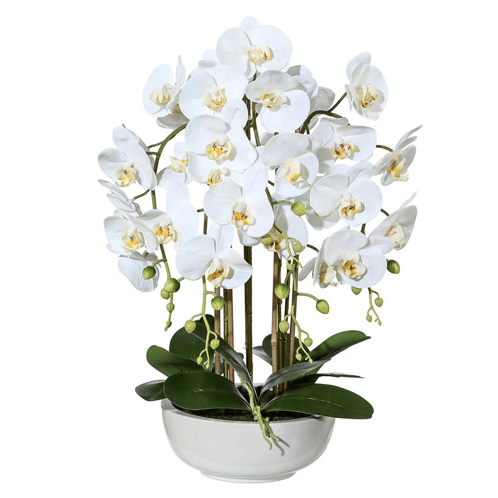 Viele Rispen und wie echt anmutende Blüten in strahlendem Weiß, Knospen sowie dunkelgrünes Blattwerk und silbriggraue Wurzeln sind fest in einer weißen Keramikschale verankert. Die einfache Pflege und der anhaltende Blütenzauber runden die gelungene Kunstblume ab.