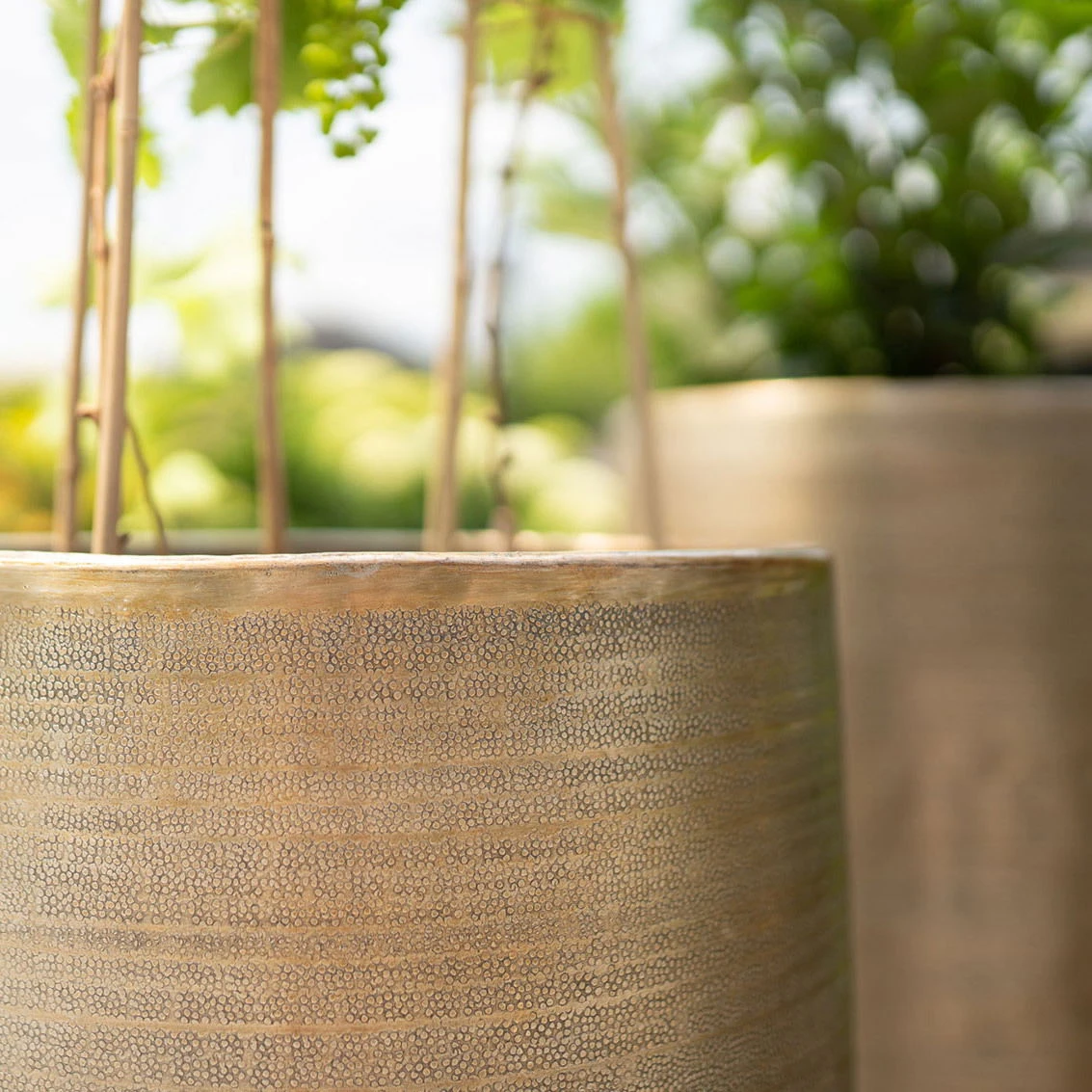 Das Pflanzgefäß ‚Rowen‘ besticht durch seine effektvolle schlanke Form und setzt dank der golden schimmernden Oberfläche glamouröse Akzente. Dieses Schmuckstück besteht aus hochwertig verarbeitetem Aluminium und fasziniert durch eine per Hand aufgetragene Oberflächenstruktur. Somit bekommen Sie mit jedem Pflanzgefäß ‚Rowen‘ ein Unikat in Designerqualität. Dabei sieht der Pflanztopf aus Alu nicht nur schick aus, sondern ist witterungsbeständig und rostfrei. Es ist problemlos möglich, dieses Gefäß ganzjährig draußen stehen zu lassen. Mit einem Fassungsvermögen von rund 43 Litern bietet das Pflanzgefäß ‚Rowen‘ genug Platz für die Wurzeln und harmoniert dank seiner schmalen Form sowohl mit überhängend als auch mit aufrecht wachsenden Zierpflanzen.