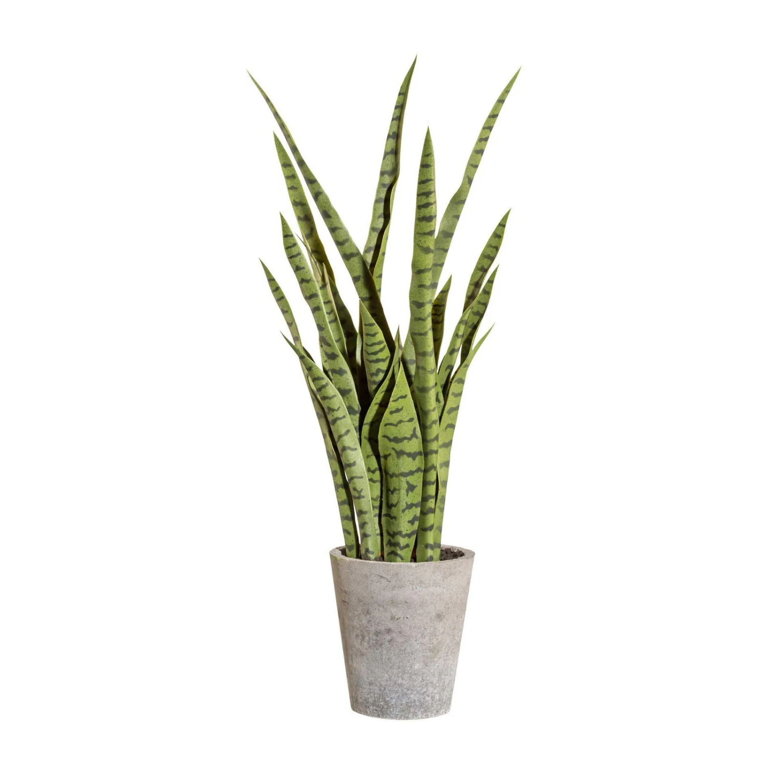 Eine sehr detailreiche Nachbildung des Sanseverie erhalten Sie in einem rustikalen Zementtopf. Im Gegensatz zu seiner natürlichen Vorlage benötigt das künstliche Duplikat keinerlei Pflege. Perfekt geeignet für alle, die den eigenen Wohnraum mit einer tollen Grünpflanze verschönern möchten, aber leider keinen grünen Daumen besitzen. Egal, ob er an einem sonnigen oder schattigen Ort steht, wo kalte oder heiße Temperaturen herrschen – Diesen Sanseverie können Sie überall ohne Probleme aufstellen. Obwohl es sich um eine Kunstpflanze handelt, ist sie in einem Topf mit richtiger Blumenerde eingesetzt. Mit vielen kleinen Details in puncto Farbe und Oberflächenstruktur wirkt dieser Sanseverie täuschend echt. Da der Topf aus Zement geformt ist, wirkt er sehr rustikal und passt deshalb hervorragend in einen modernen Haushalt.
